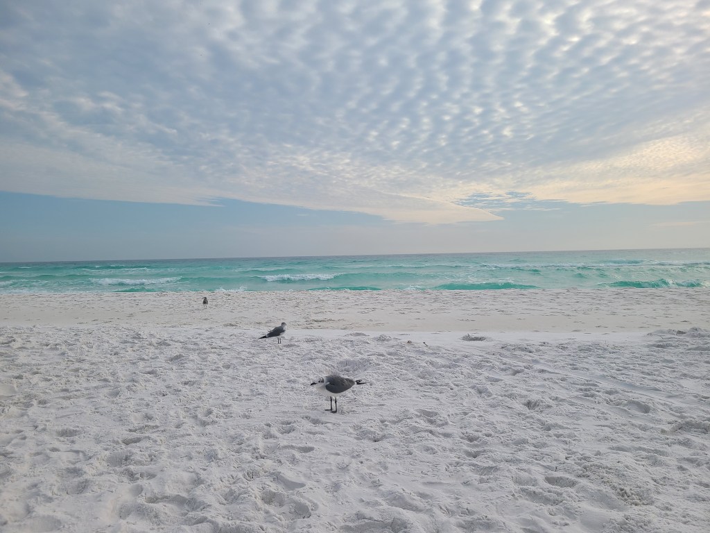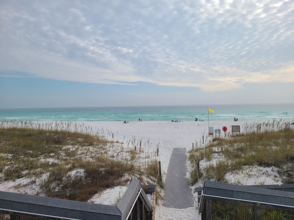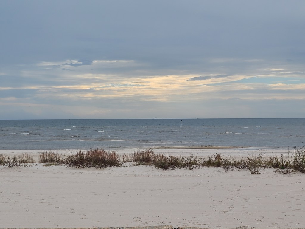 Which was, of course, the rest of the muffuletta. Complemented by an iced latte, I thought I’d stop at a beach and watch the gulf waves. Except there were no beaches. There were resorts, restaurants, bars, and all sorts of things. But no public beaches. I finally found a state beach a ways down the road. For four dollars entry it was a bargain! Plenty of parking, covered picnic area, restrooms, and a nice long land dock leading to the beach proper. I headed out and planted myself in the sand and began munching my sammich. Not too many people on the beach, but it wasn’t abandoned.