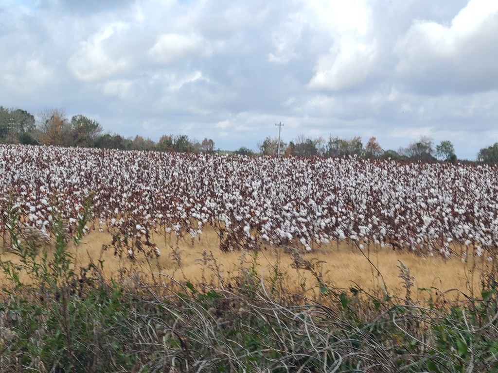 The cotton is baled into gigantic truck sized toilet paper rolls with likely plastic around the outside. But when they’re in transit little bits of cotton get blown off, and they end up on the side of the road.