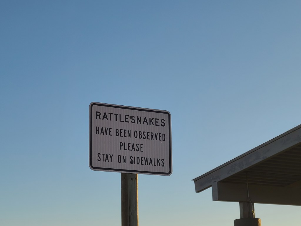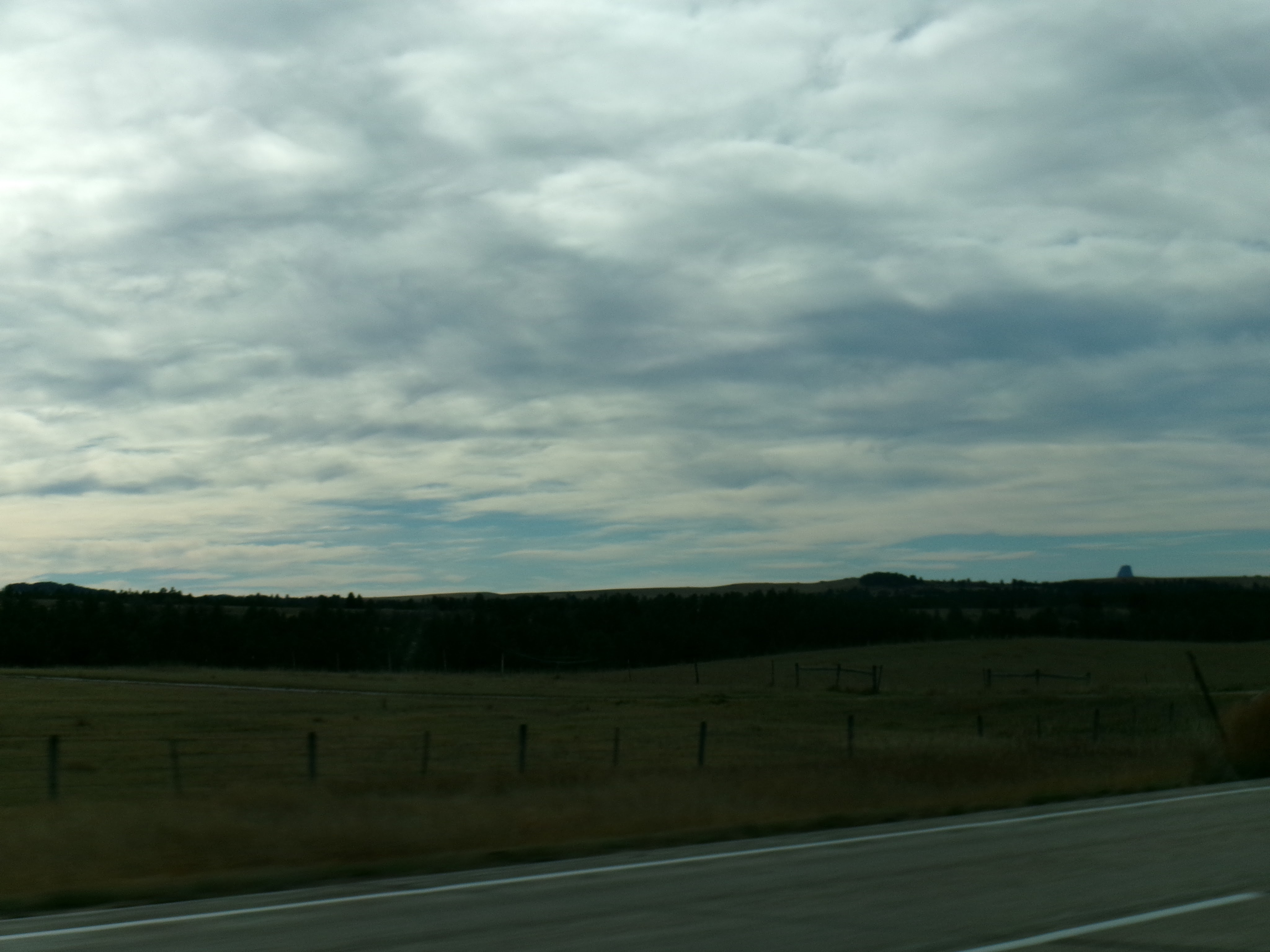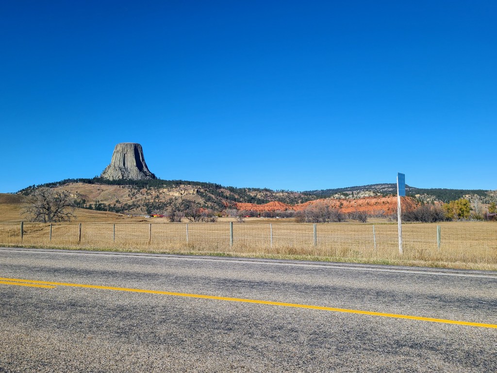 I had to get out my ice scraper. Too much frost for me to even just run the heater and use the wiper wash.This is an odd one. It looks like a sunset. But it was in the morning. And on the wrong side of the sky. Strange.Why yes, that does say 22 degrees.More snakey snakey goodness. Didn’t see any though.If you look off on the right in the distance, you can see Devil’s Tower!