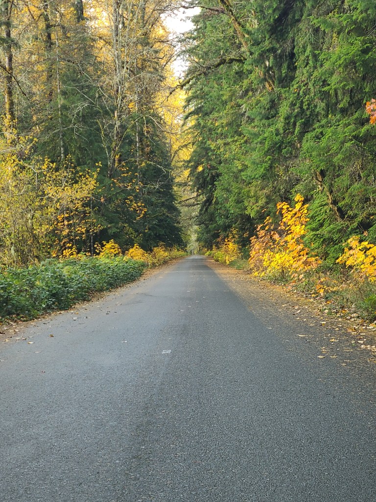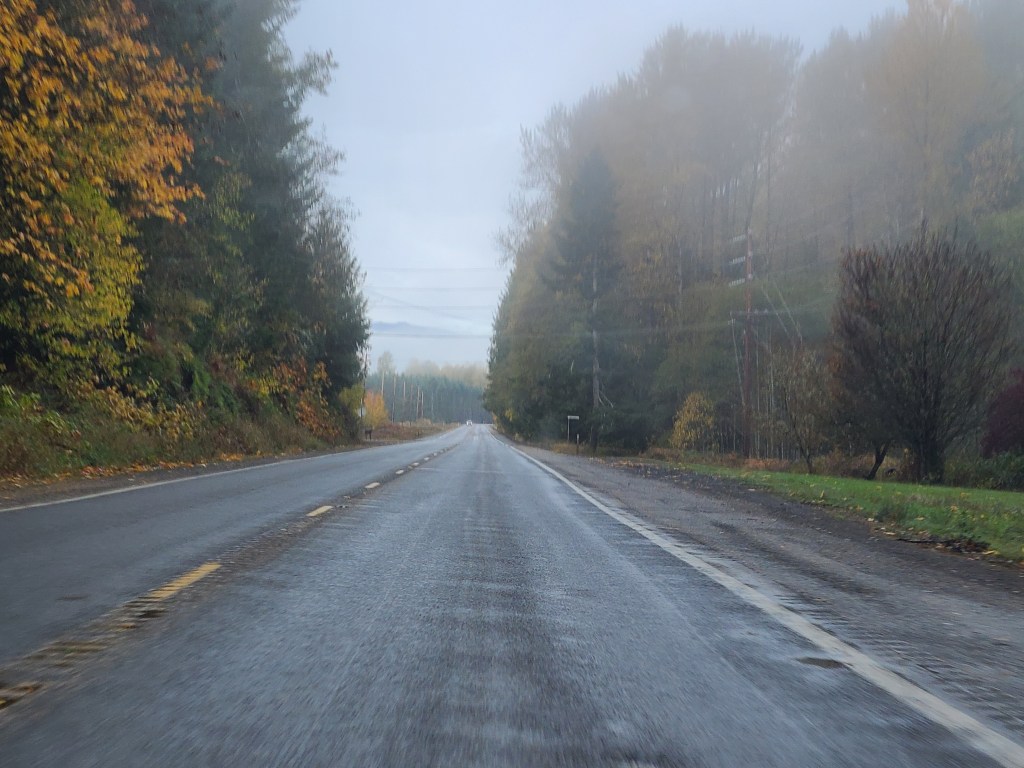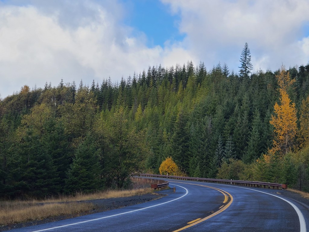Coming out of Yakima I headed west on 12 into the White Pass. There was a sign listing that pass and another one, and the other was closed. Made my trip planning skills shudder to think how easily they close and less easily open. It had just rained, so the roads were wet. No problem there, except the spray. The car in front of you kicked it up unless you followed waaaay back, and oncoming traffic hit you with it as well. I made a risky pass overcoming an RV because it was like following a shower, and I wasn’t going to do that all the way over the pass.