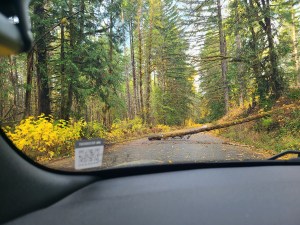 The road was rough but in decent shape, clearly not a lot of traffic came by here. There were a number of spots where a tree had fallen across the road but had been chainsawed into submission. Some of the patched areas were teeth jarringly rough, but few and far between. Slowing down for curves was less about going off the curve and more about being prepared if another car was coming the other way. The road was just more than one lane wide. It was so much fun! Up and down and left and right! But after five miles the signs saying it would be closed were more frequent and looked more confident. But it wasn’t an official chain across the road that stopped me, it was a tree.