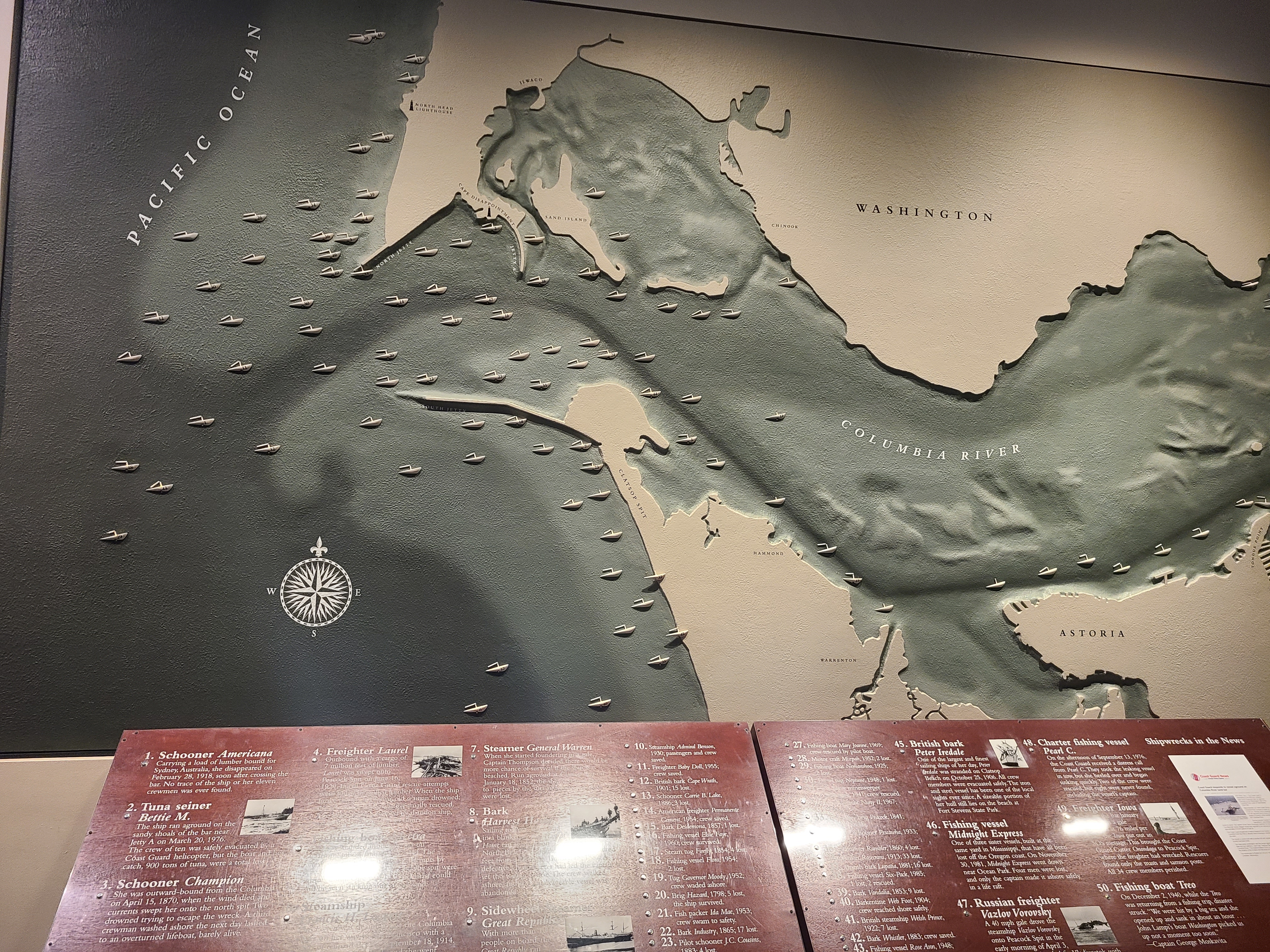 Where the Columbia river meets the ocean, there are sandbars which are moving on the regular. This is a map of shipwrecks. It’s hard going from one environment to the other, even before you add in near constant rain, perpetual fog banks here and there, and unpredictable high winds.