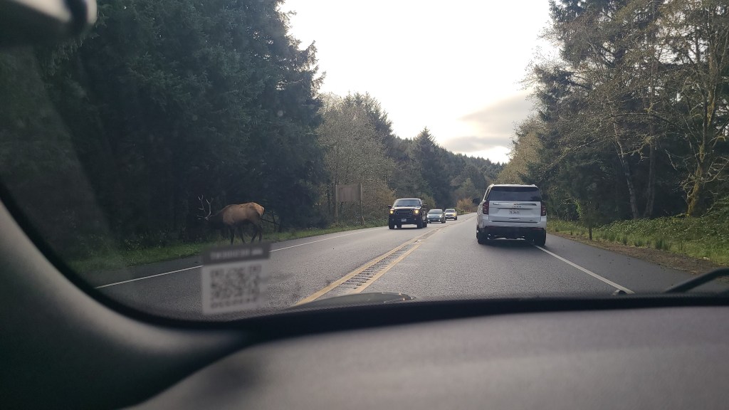 I really enjoyed it when the roads became constantly twisty. Up, down, left, right. Cliffs going up on the left, deep dropoff on the right. Sometimes in the woods, where it gets nice and spooky. There was rain much of the day, and they threw in some fog just to sweeten the deal. Having seen Elk warning signs and Tsunami hazard zone signs, that get you: