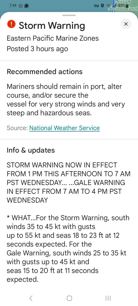 Guessing the mileage is near 2,500 miles. It was 2,200 yesterday and I forgot to mention it, and I put on ~240 miles today, so.. I’m not catching the round numbers very well. I don’t care. Passed a sign today that warned of “sunken grade” which apparently is notifying that the earth under the road has either slid away, or could at any time. So a live slide warning, I guess. The first fun was the Storm Warning that google said could impact my trip. I’m imagining getting gale force winds blowing me off the cliffs.